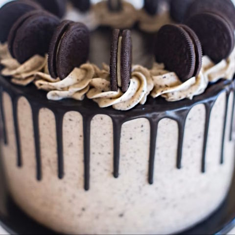 Cookie and cream cake filled with crushed cookie and vanilla cream.