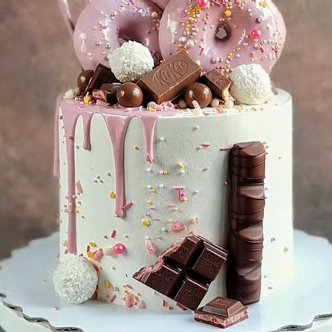 Cake filled with strawberry and white chocolate truffle, dressed with donuts, chocolate bars, macroons etc.