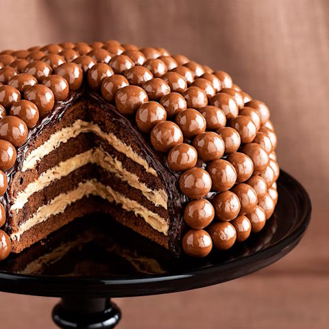 Chocolate cake with triple chocolate layers topped with ganache balls, truffle, macroon etc.